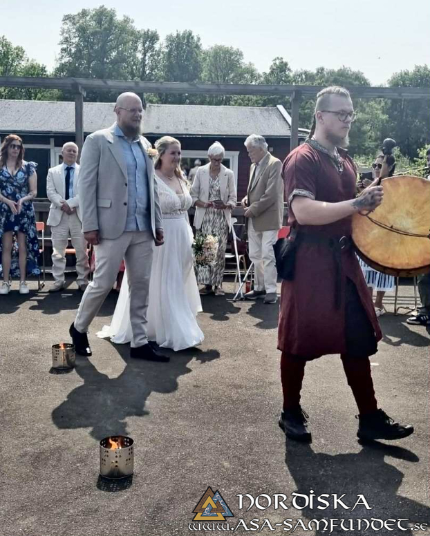 Ett fyrtiotal gäster, både barn och vuxna upplever för första gången i sina liv en ceremoni där våra fornnordiska gudamakter kallas in att föreviga de löften paret ska ge varandra, Laban är trygg där han utför sina uppgifter och snart förkunnar jag paret vigt.